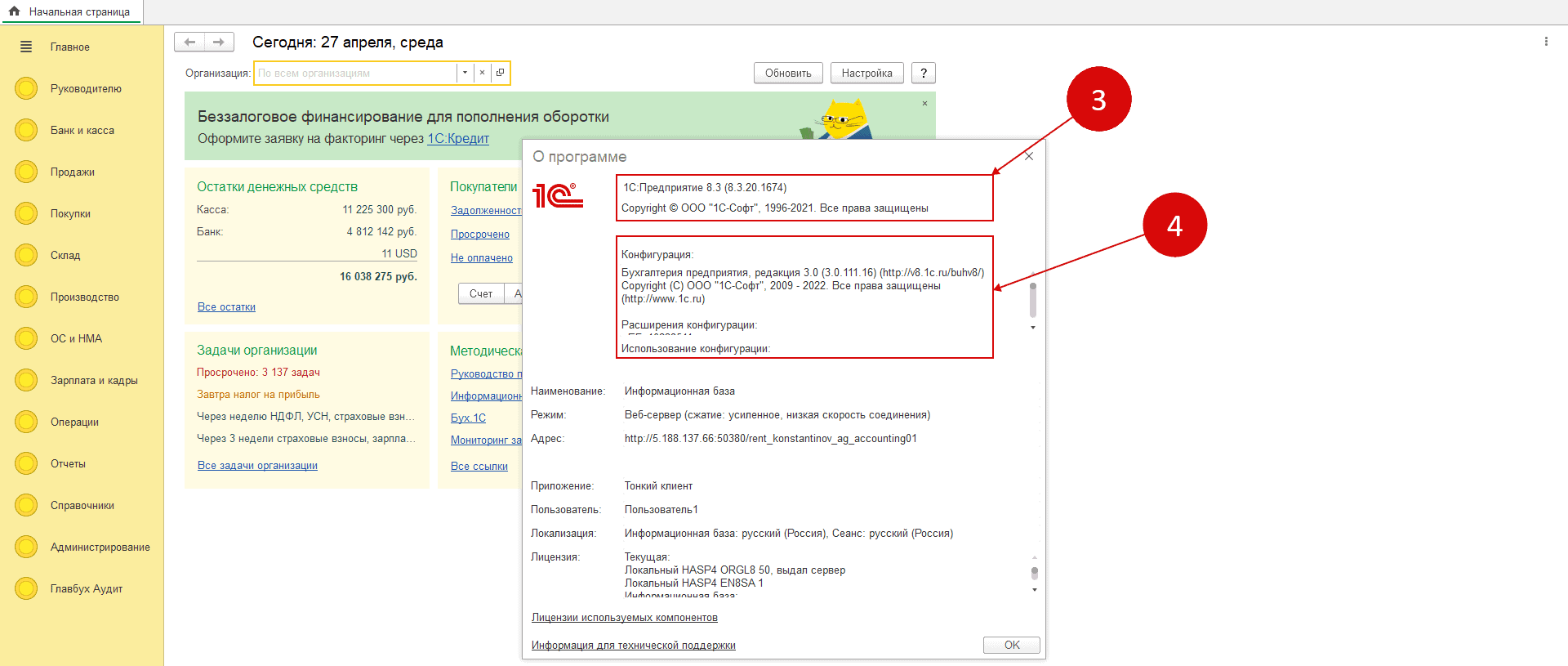 Откройте программу 1С, кликните в правое верхнее меню “Сервис и настройке” (1) и выберите "О программе" (2). Откроется окно с номером версии (3) и названием конфигурации (4).