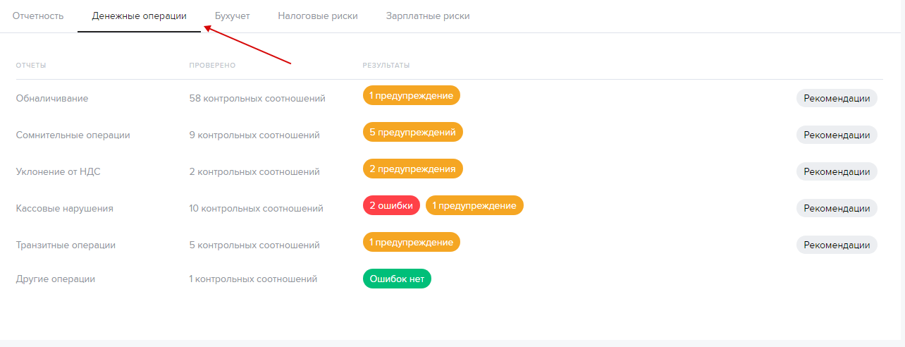 После загрузки выписки результаты анализа вы увидите на главной странице (вкладка “Денежные операции”).