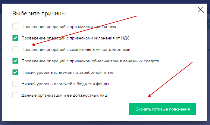 Выберите подходящую причину подготовки пояснений нажмите кнопку “Скачать готовые пояснения”. Пояснения для банка будут скачаны на ваш компьютер.