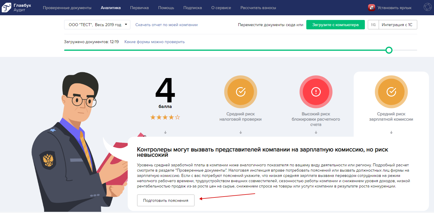 Выше на странице “Аналитика” будет показан уровень риска вызова должностных лиц компании на зарплатную комиссию: