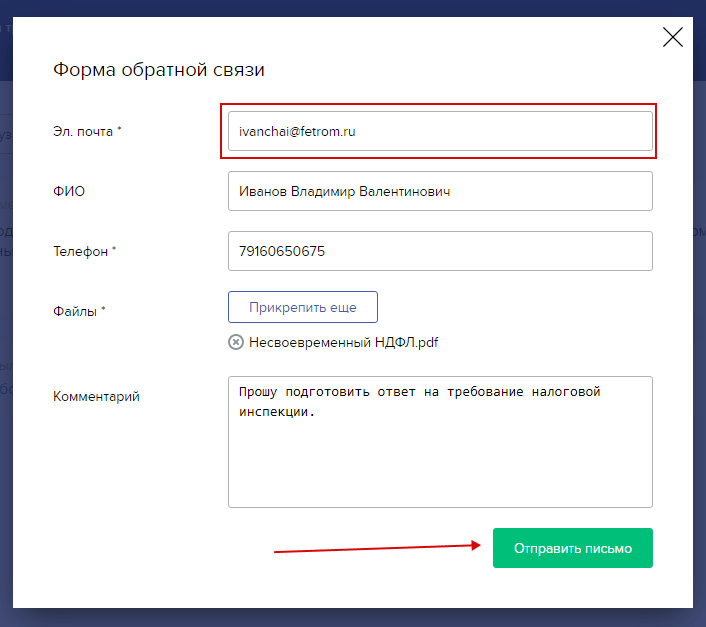 В открывшемся окне проверьте вашу почту. На нее будет отправлен готовый ответ на требование. При необходимости напишите комментарий и нажмите кнопку «Отправить письмо». Через три рабочих дня мы подготовим ответ и вышлем его на вашу почту.