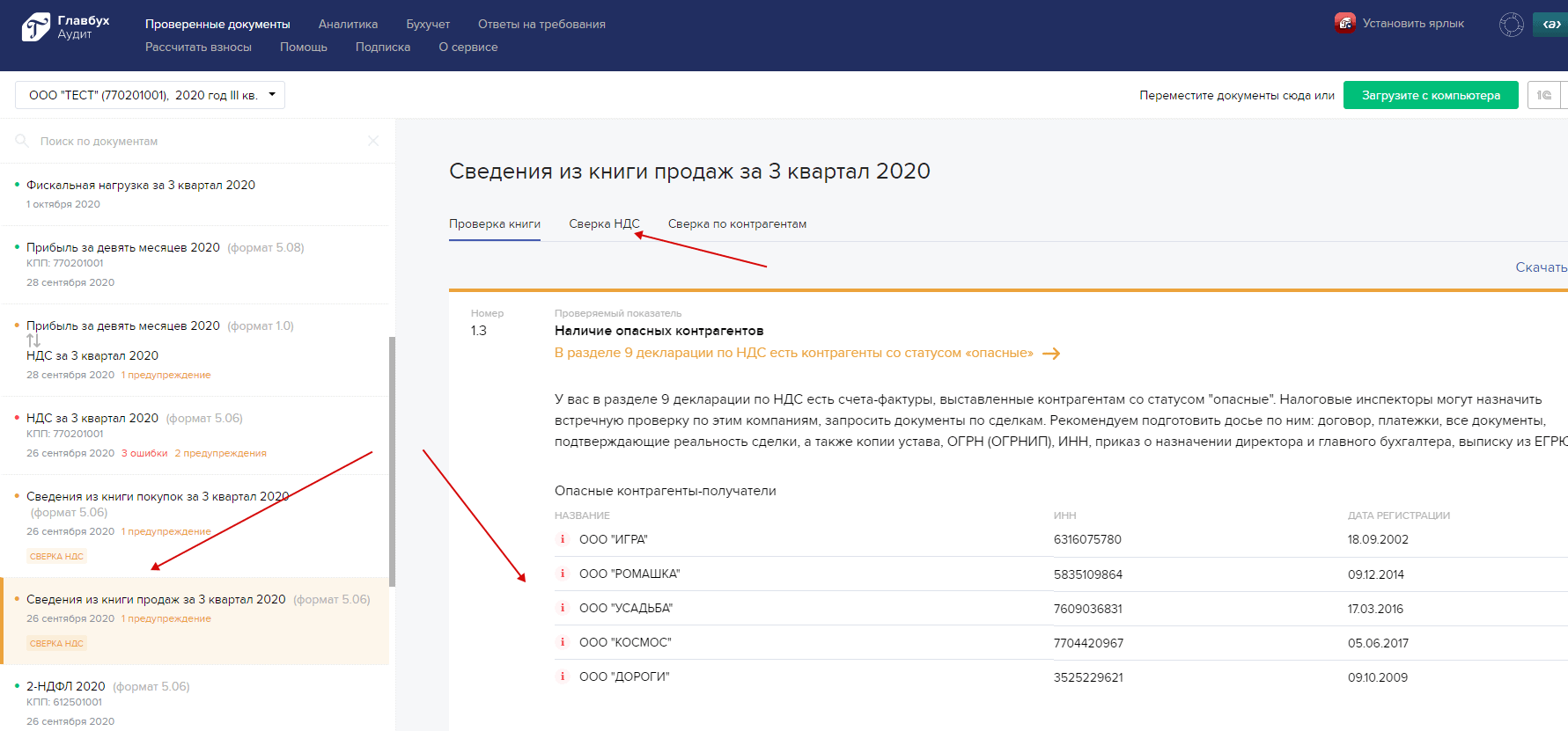 Сервис проведет проверку формы и покажет количество опасных контрагентов. Далее кликните по вкладке «Сверка НДС». Сервис начнет поиск счетов-фактур, которые указаны в вашей книге, по своей базе данных.