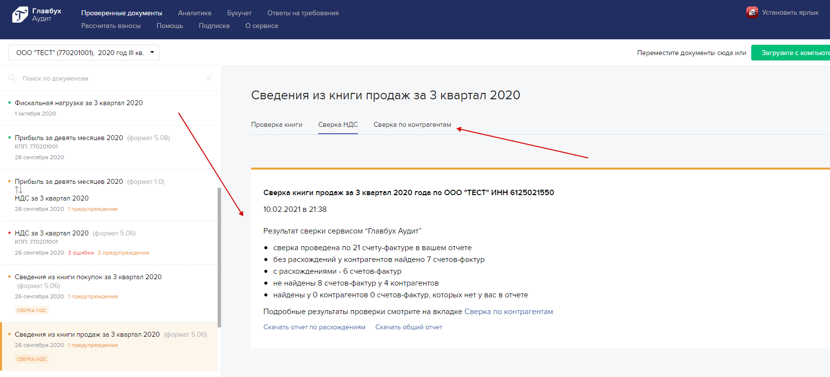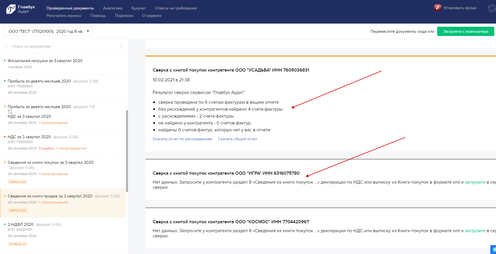 После проверки вы увидите результат. Сервис «Главбух Аудит», в частности, покажет, сколько документов было проверено, по каким были выявлены расхождения и какие совпали, сколько документов в базе не найдено. Чтобы посмотреть результаты сверки по каждому контрагенту, чьи счета-фактуры зарегистрированы в вашей книге, перейдите на вкладку «Сверка по контрагентам».