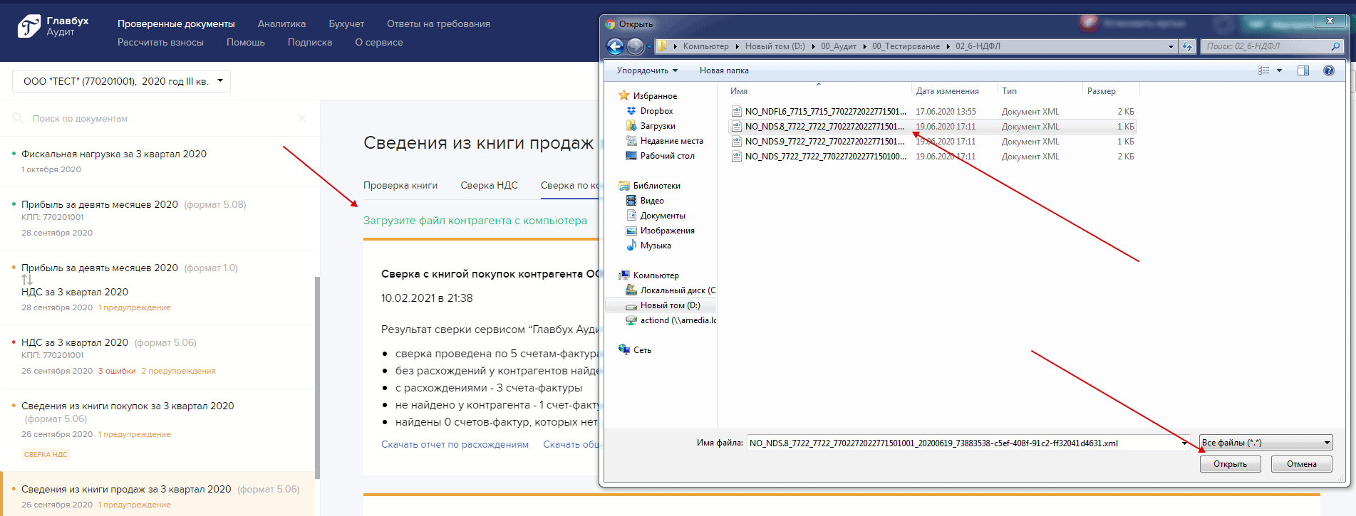 Чтобы провести сверку, загрузите в сервис книгу покупок (продаж) или файл с разделом 9 (8) декларации по НДС.