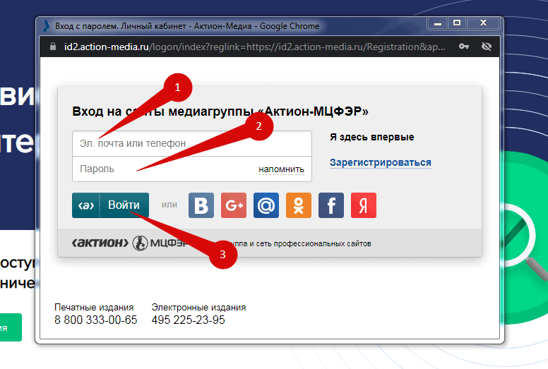 Нажмите на кнопку «Вход и регистрация». Откроется окно авторизации для ввода логина и пароля под которыми вы зарегистрированы на сервисах компании «Актион»