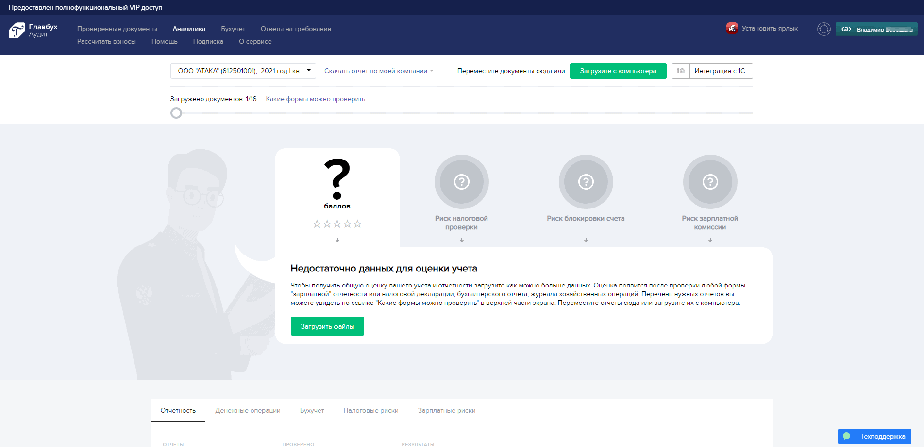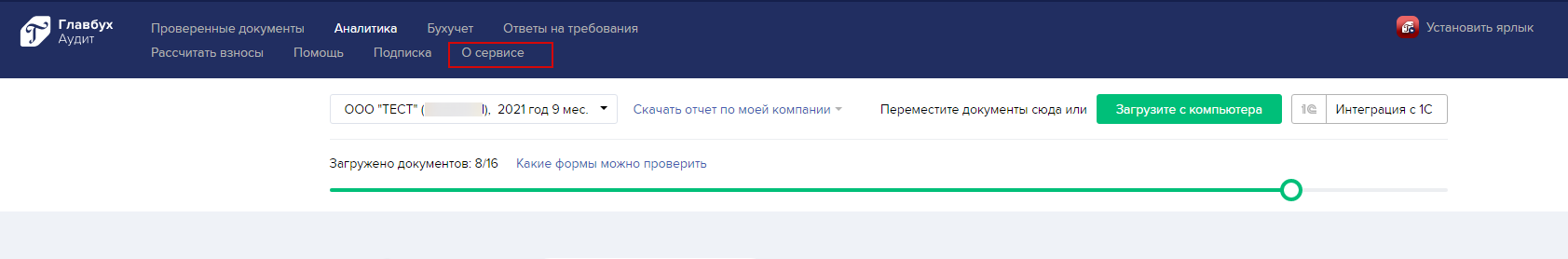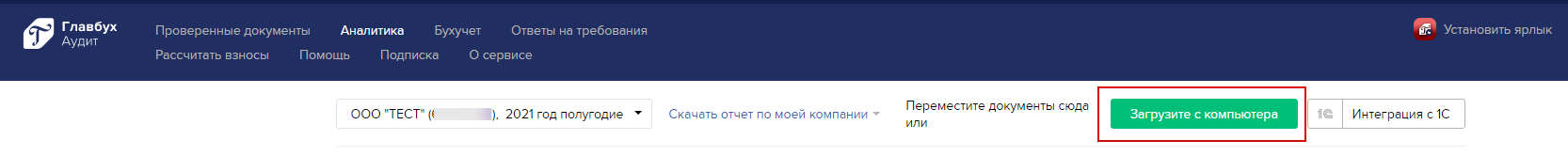 Вы вошли на главную страницу сервиса «Главбух Аудит». Сервис активирован и готов к работе. Для начала работы загрузите любой отчет в сервис.