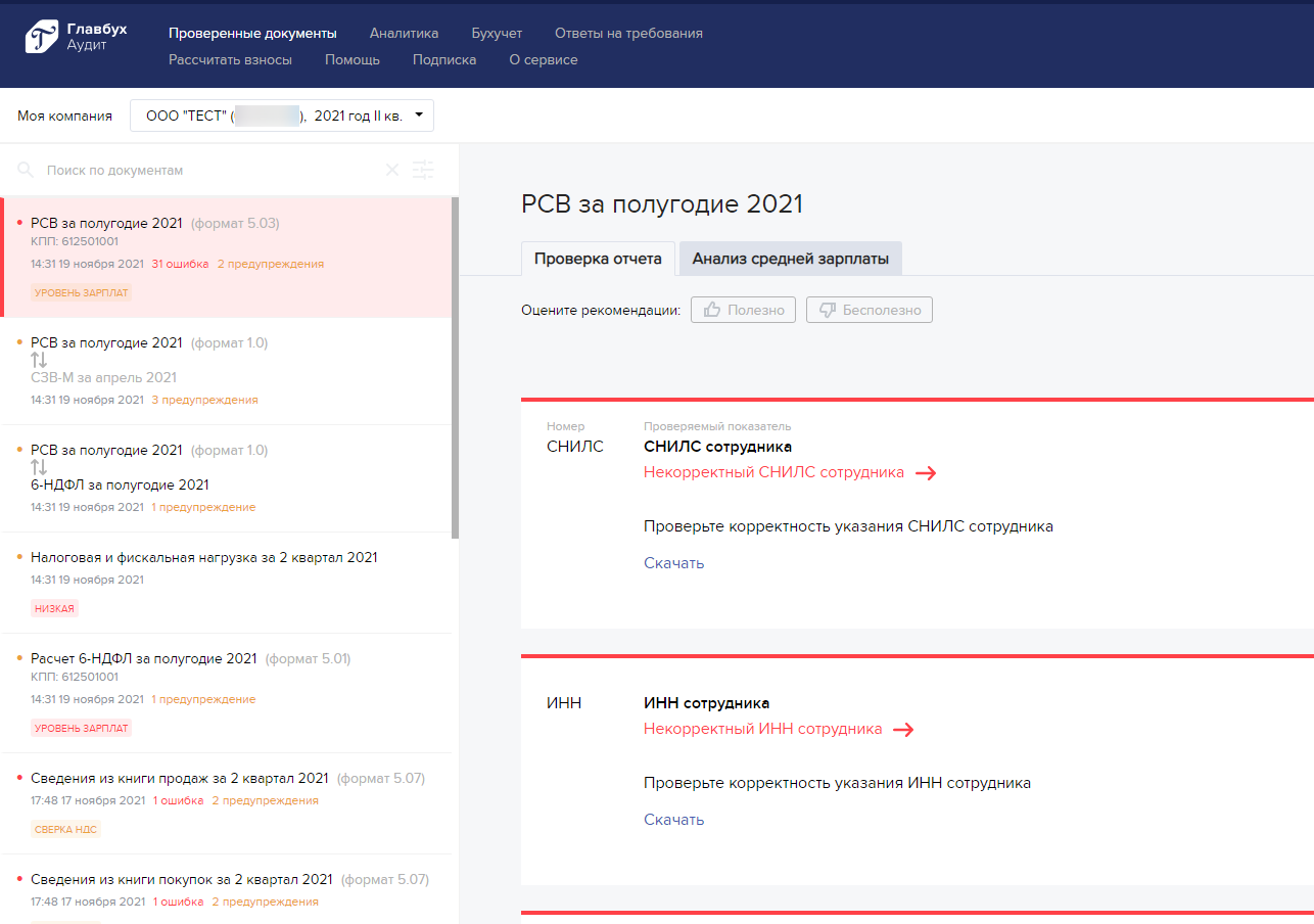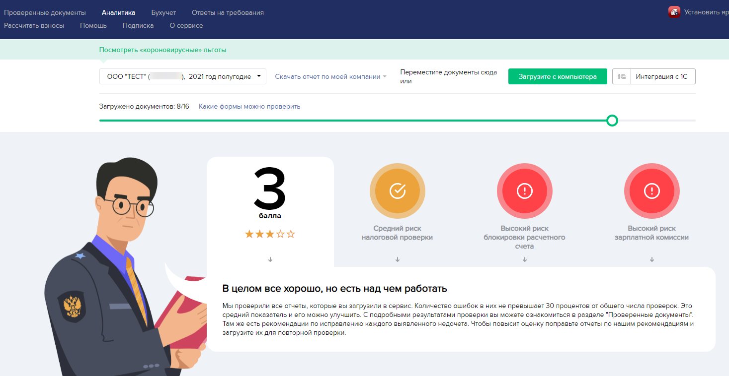 Внутри каждой каждого профессионального ПО раздела собраны аналитические данные о проверках загруженных клиентом отчетах, которые он собирается отправить в проверяющие органы: