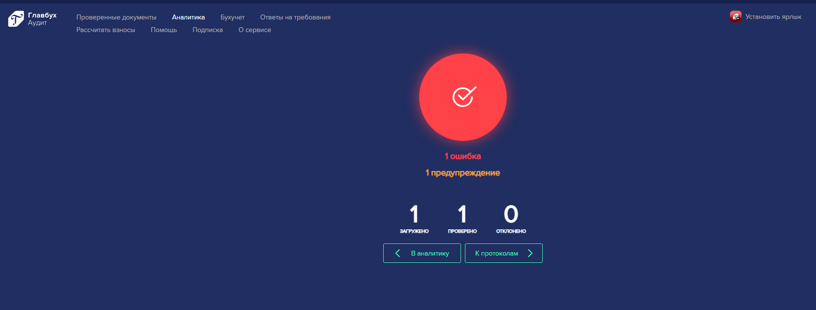 По окончании загрузки документа будет отображен предварительный протокол (результат) проверки, после которого клиент может перейти в аналитику либо в список протоколов нажатием на соответствующую кнопку.